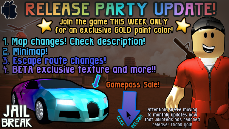 Jailbreak Roblox 2018 Wiki - Zabawki Roblox Jailbreak - All Roblox Promo Codes 2019 ... - Roblox made it even easier to acquire the copper key.. Download mp3 hinami mask ro ghoul roblox 2018 free; Police players are given the task of stopping crime and arresting criminal players. Primary places include buildings, such as robberies, gun shops, and garages. Gaming with kev playing roblox jailbreak; It accumulated over us$1 million in revenue during its first year of operation.